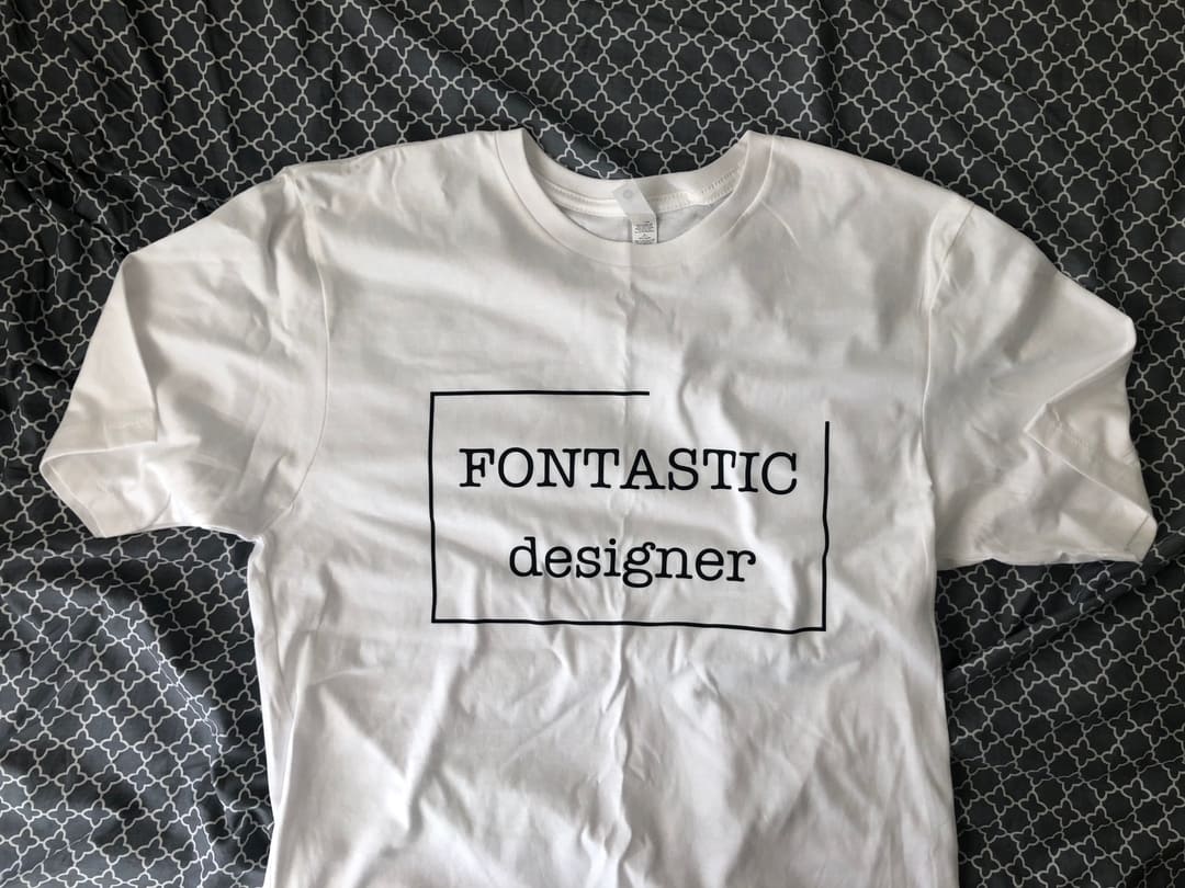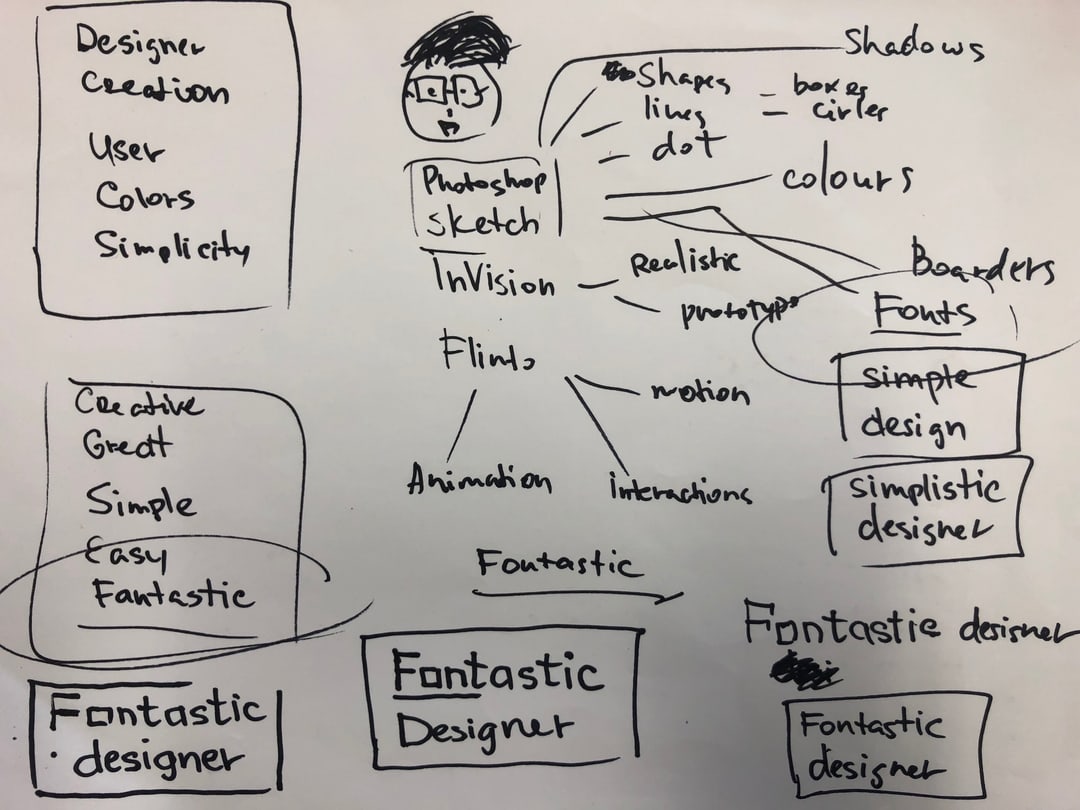 I start with words that can describe some ordinary designer and cover it in some funny way. A goal was to make something simple but noticeable. So I decide to play with words and just add some shapes to it. I did brainstorming, put everything on paper. I was using different adjectives and nouns that can be related to our future work. Finally, I found two: "Font" and "Fantastic" and connect them together. That brought me to a word "FONTASTIC". After I added a box around it to make it look nice.